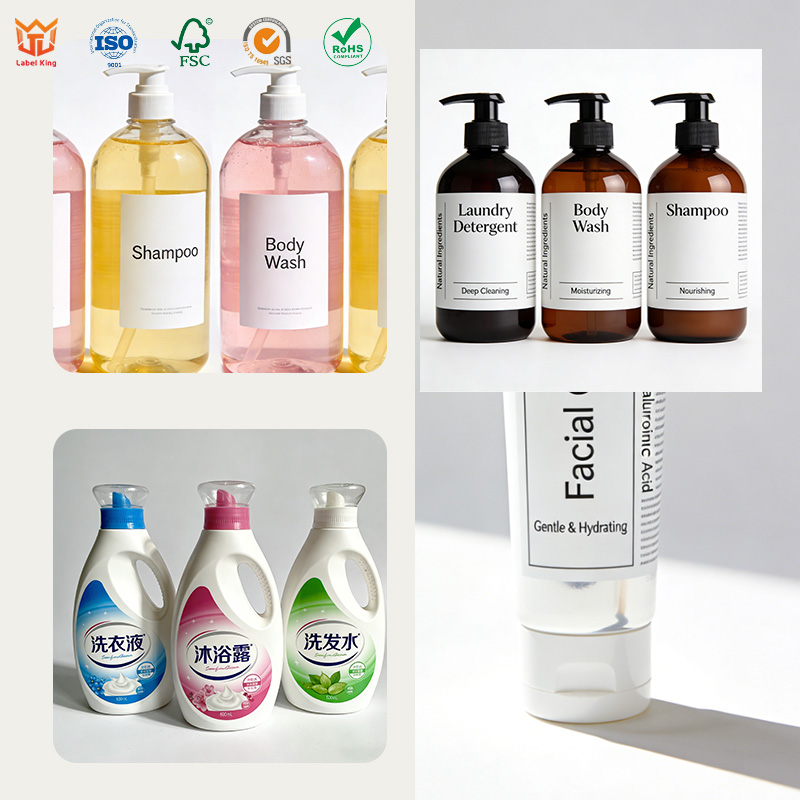 Ετικέτες φιαλών καλλυντικών, ετικέτες απορρυπαντικών (το γαλακτώδες λευκό ενισχύει την αντίθεση εκτύπωσης).